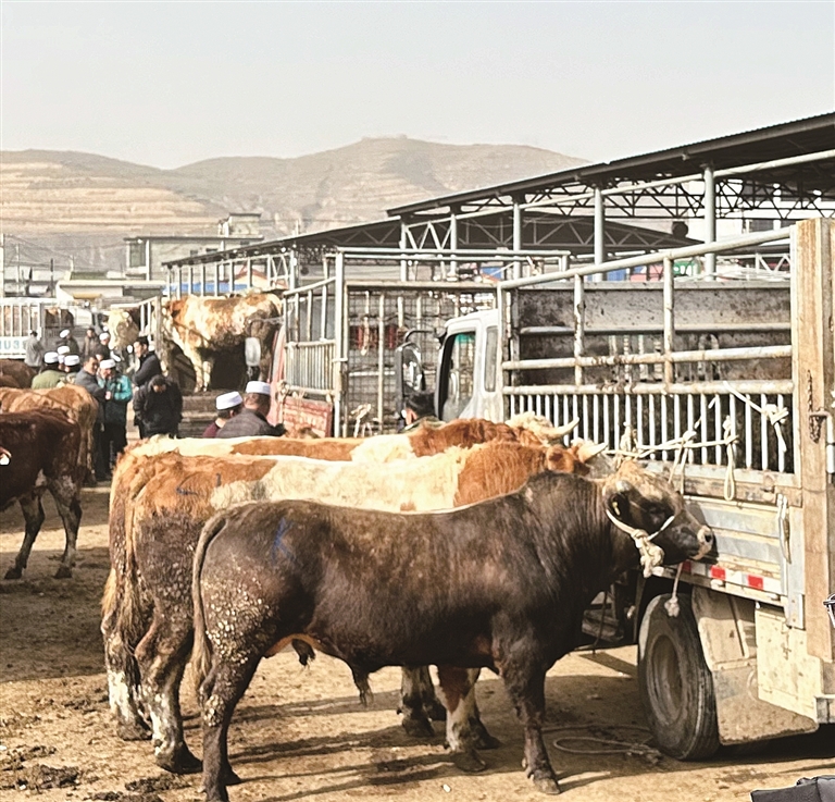一路上,我们看到载着肉牛的农用三轮车、卡车来来往往。足有六七个足球场大的交易市场上,密密匝匝挤满了各个品种的牛,人声、牛声鼎沸,管理人员耐心地引导着车辆,牛经纪用传统的袖筒内“揣手手”议价,还有人架起手机现场直播……