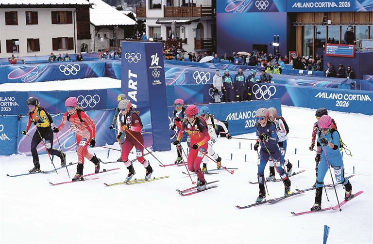 当地时间2月21日,米兰-科尔蒂纳冬奥会滑雪登山混合接力比赛在意大利博尔米奥举行。图为参赛选手在比赛中出发。 新华社发